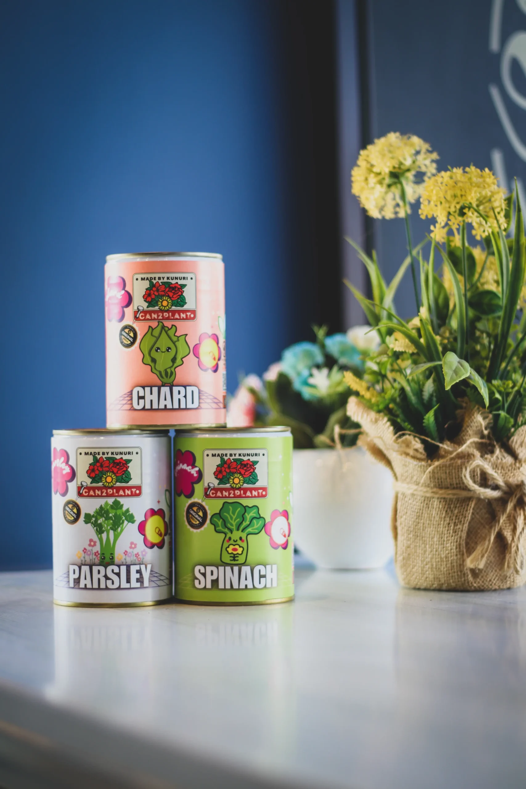 Ce kit contient 3 Can2Plant : épinards, persil et blette, chacun prêt à pousser avec terre, graines et tout le nécessaire inclus.